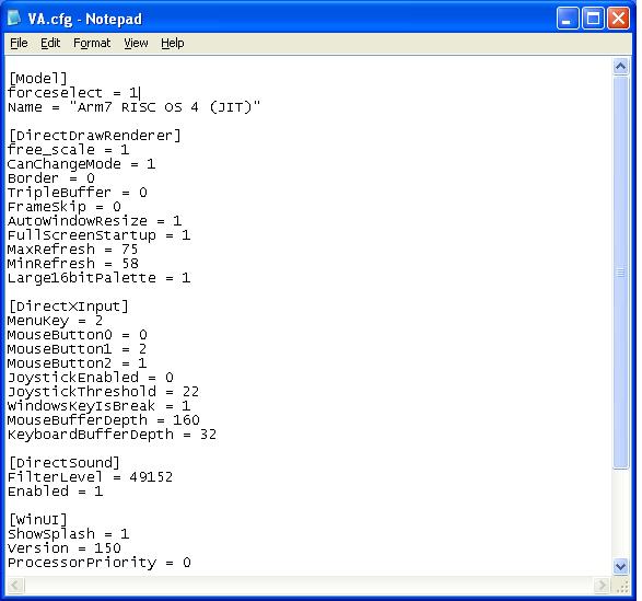 In which case change it so that the ForceSelect value is 1. Now simply save the file from NotePad using the Save menu and load VRPC-SA. It should now start up with the processor select window. You can now choose the Arm7500 and start using big screen modes in RISC OS Select.