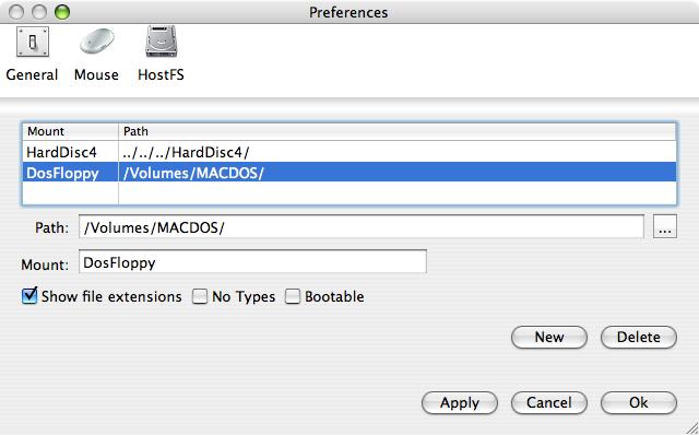 Apple computers behave in a different way to most other machines. Instead of mounting the drive itself, they mount the media. This means that unless an external USB floppy drive has a disc inserted it simply does not appear. This is quite different to the way that RISC OS and Windows operate. You need to remember this important difference. Using the method shown below it will be possible to set up a HostFS mount that reads/writes to a particular floppy disc. This does not mean that you will be able to read any floppy disc in the external USB drive, but that you can read one particular floppy disc with a particular name.