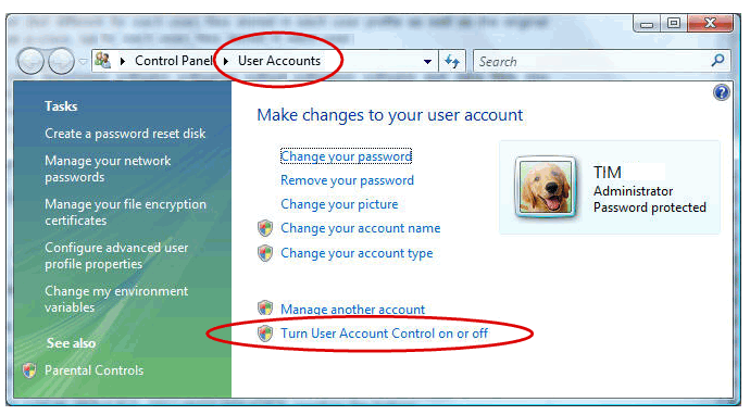 Firstly open the Windows Control Panel. Top right of the Control Panel window is the Search box. Below this is the View byoption for altering how the Control Panel is displayed. Click the little arrow and choose Large icons. All of the control panel options will now be displayed. Click on User Accounts and then click on Turn User Account Control on or off.