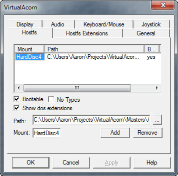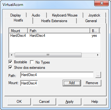 The problem happens when the link to the HostFS 'HardDisc4' mount gets severed. In this example the VirtualRPC was copied over a network, but the configuration for the 'HardDisc4' mount still pointed to its location on the original PC. Take a look at this 'Tools.Options.HostFS' configuration window: