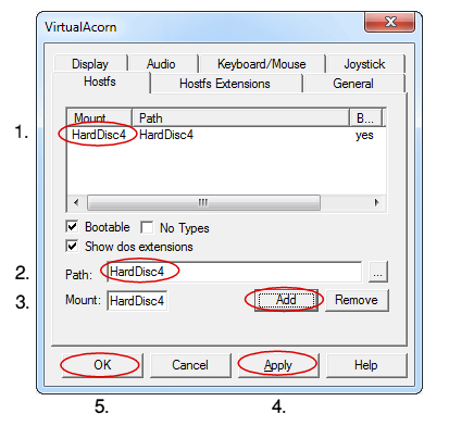 To make this correction select the 'HardDisc4' Mount from the scrolling section of the HostFS options window by clicking on it. The details for this mount will then be copied to the lower section of the window. Correct the 'Path' entry so that it points to the real location of 'HardDisc4'. Now click Add, then Apply and finally OK. This illustration explains the order in sequence: