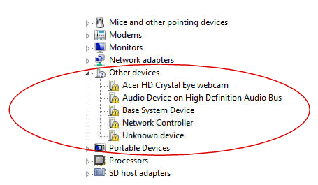 The image above shows how the Device Manager should look, the name of the PC is at the top with a neat column of right facing arrows underneath. If you find an entry in the Device Manager headed Other devices then some drivers are either corrupted or missing: